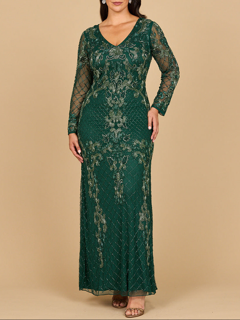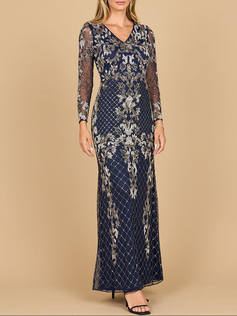Lara 28877- Long Sleeve Contrast Beaded Gown