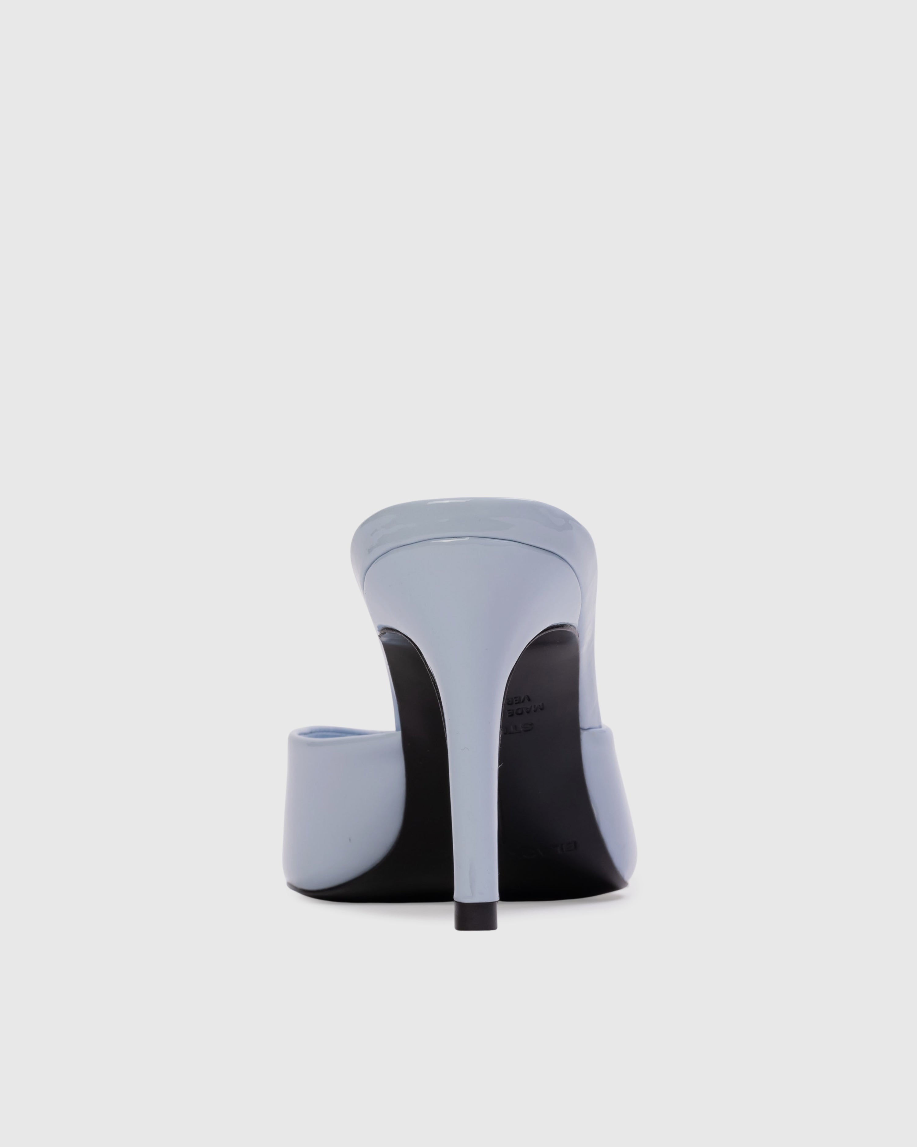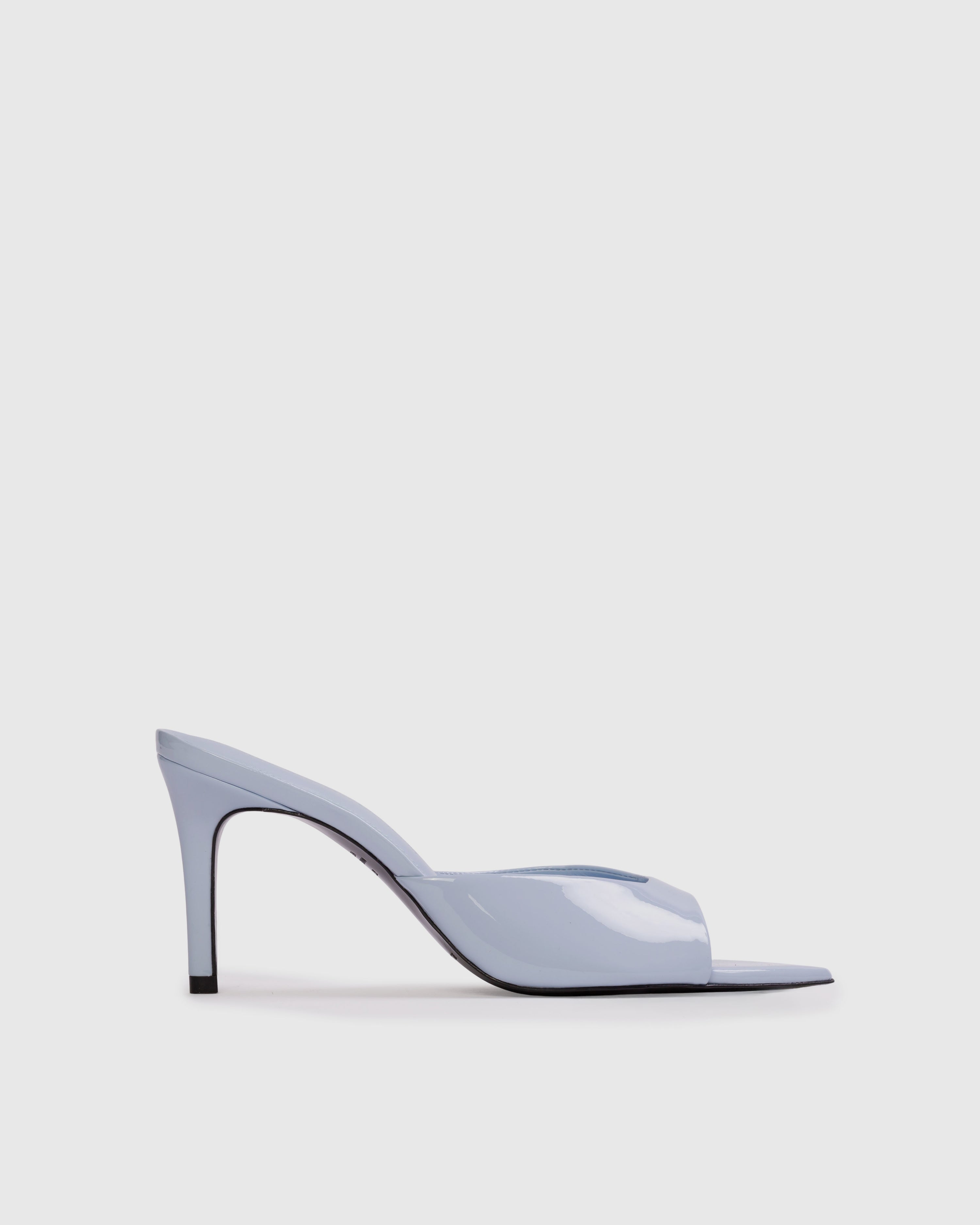 Pointy toe slipper mule, set on a straight high heel. Made with patent finished leather.