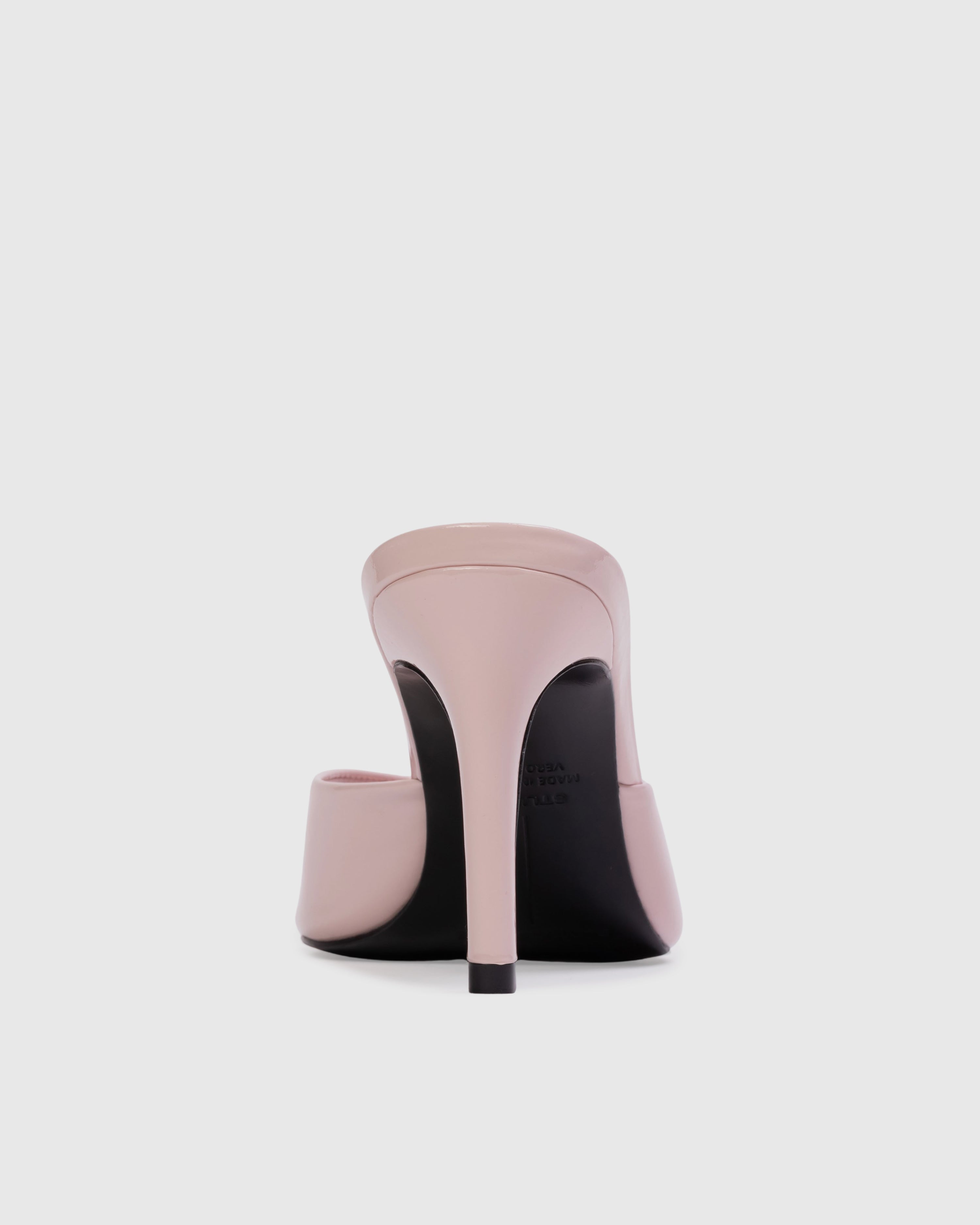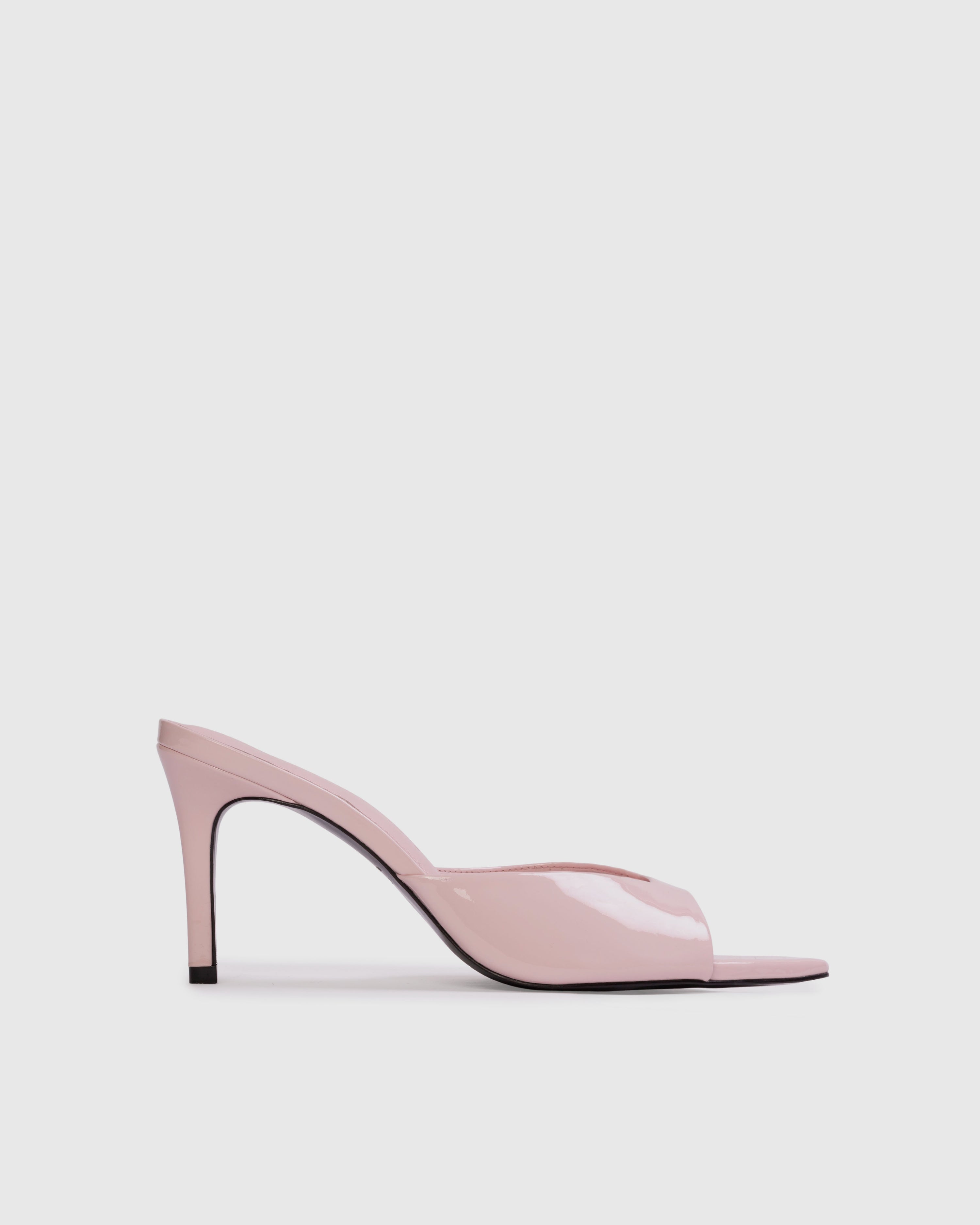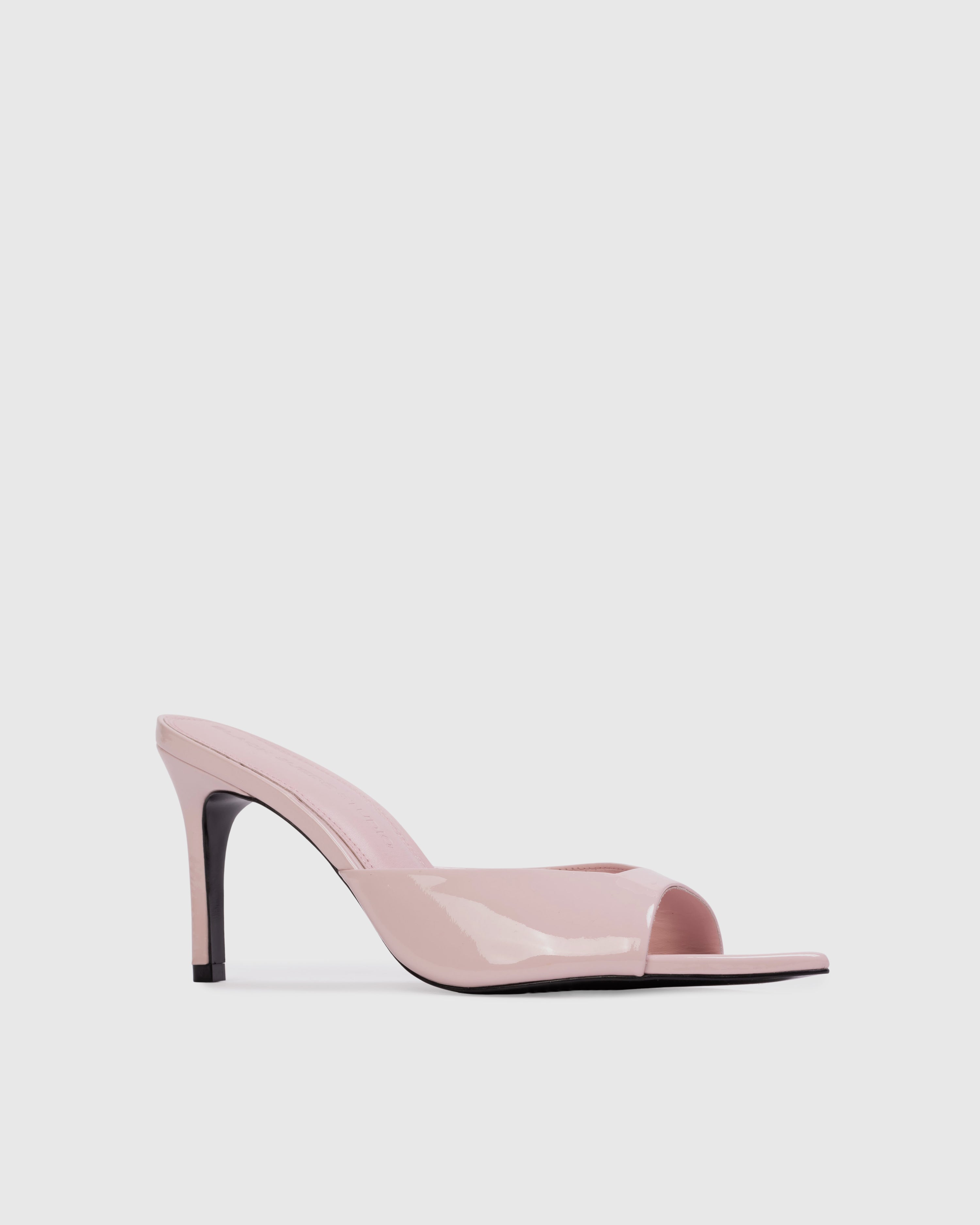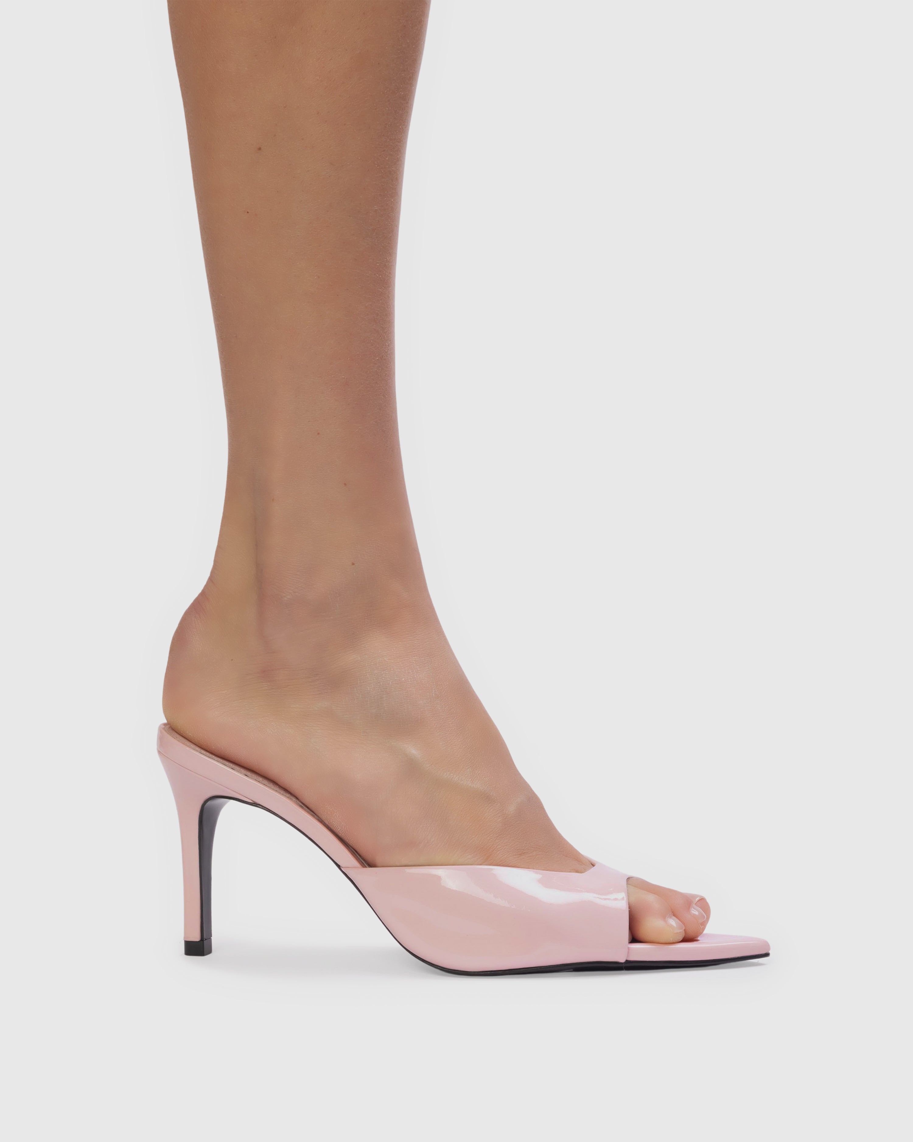 Refined pointy-toe slipper mule elevated on a sleek, architectural high heel. Crafted from lustrous patent leather with an impeccable finish.