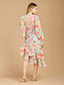 A showstopper! Long blouson sleeve midi dress with an asymmetrical ruffled hemline in a floral pattern. Features a high neckline but is a party in the back with lace-up details!