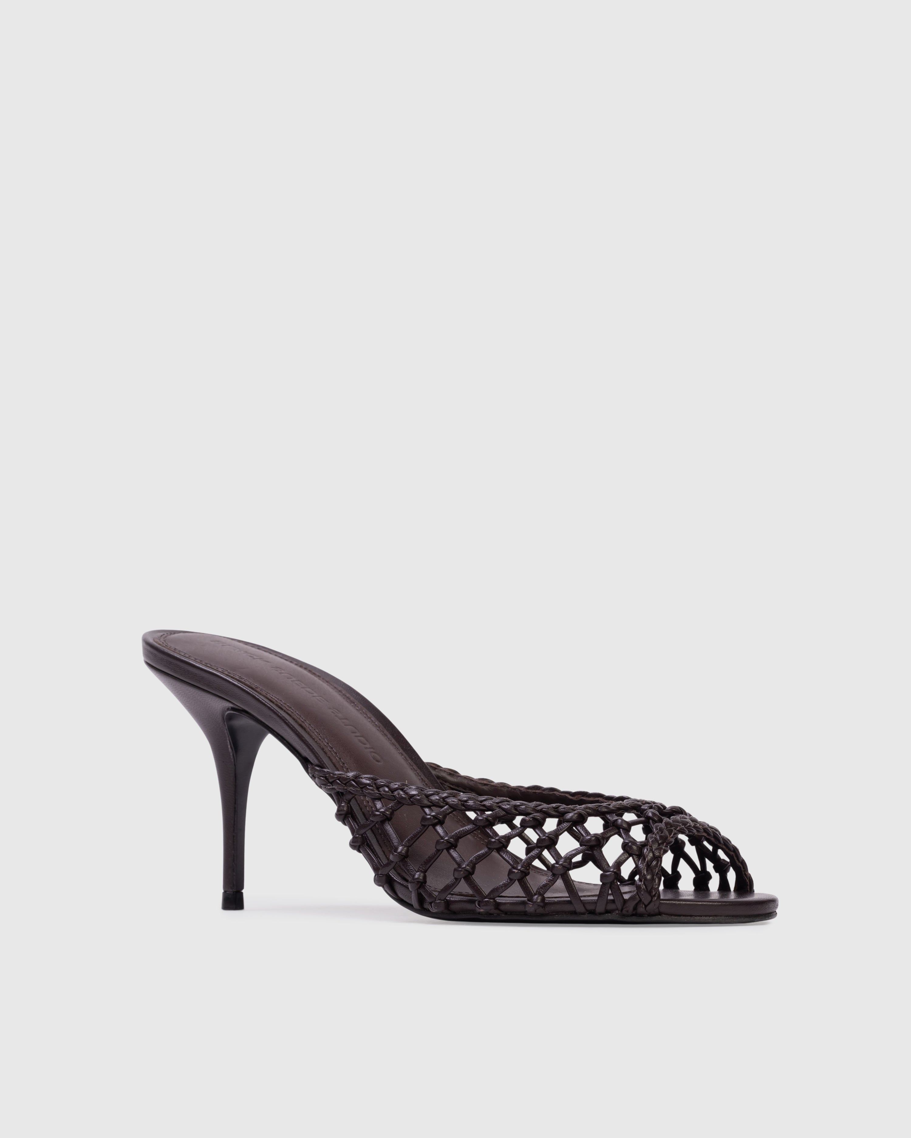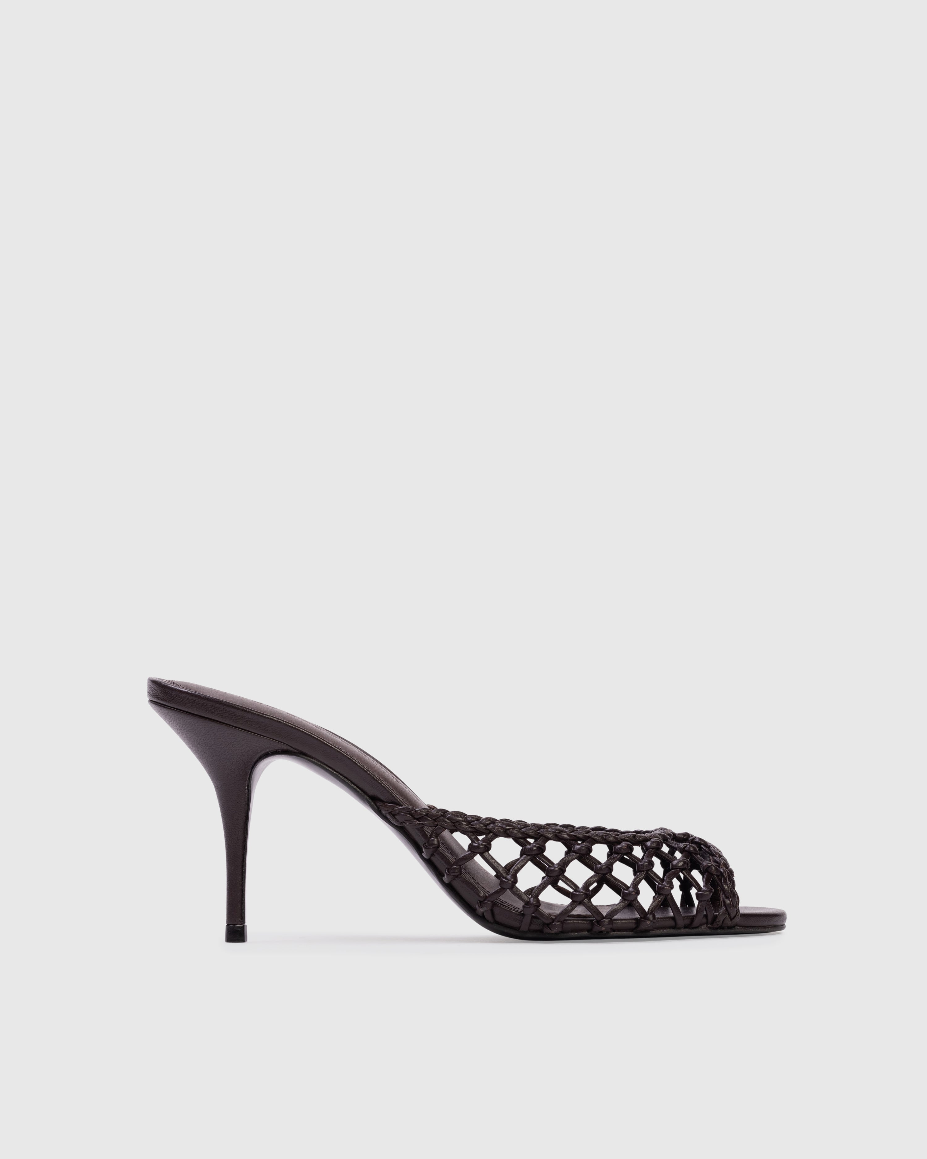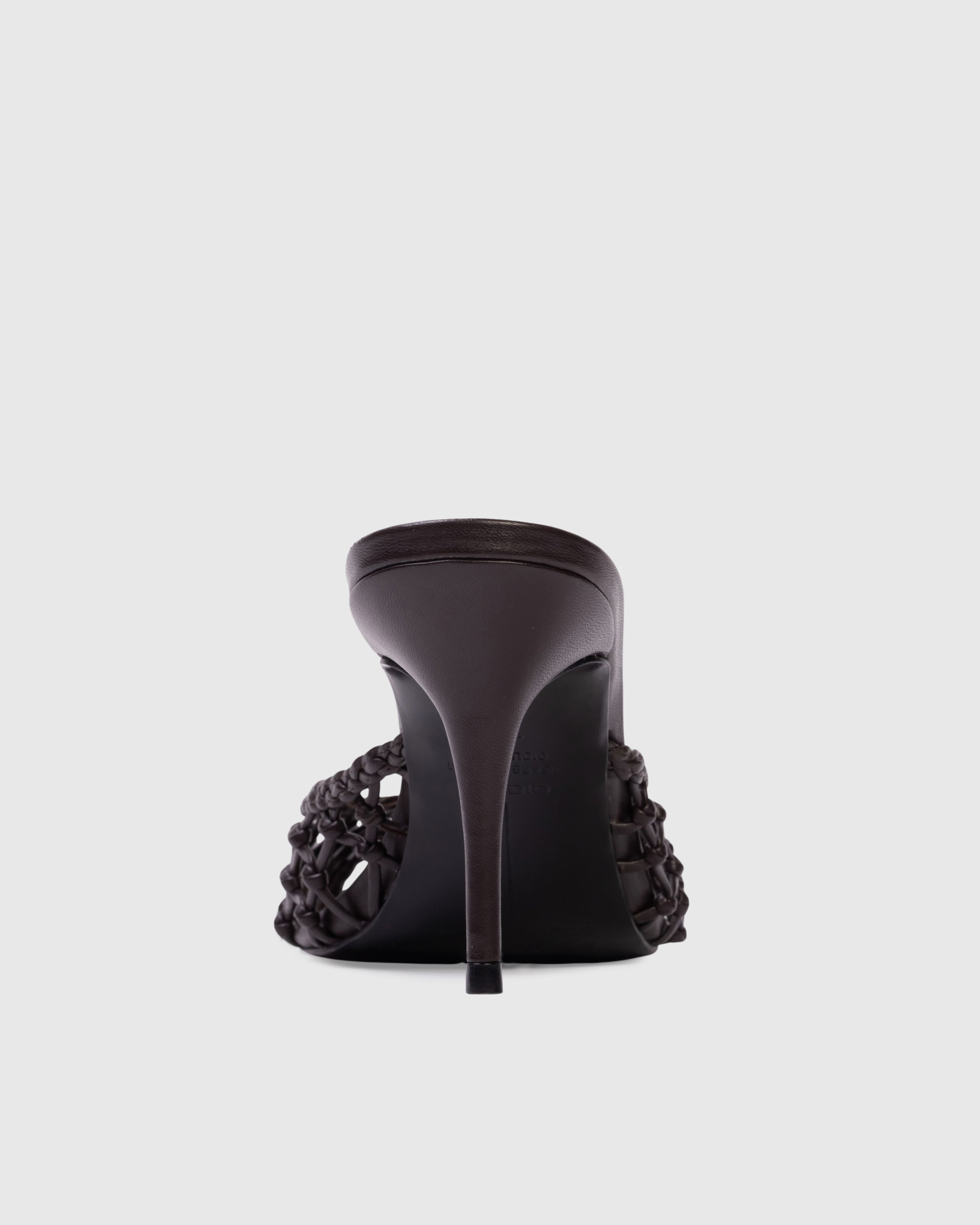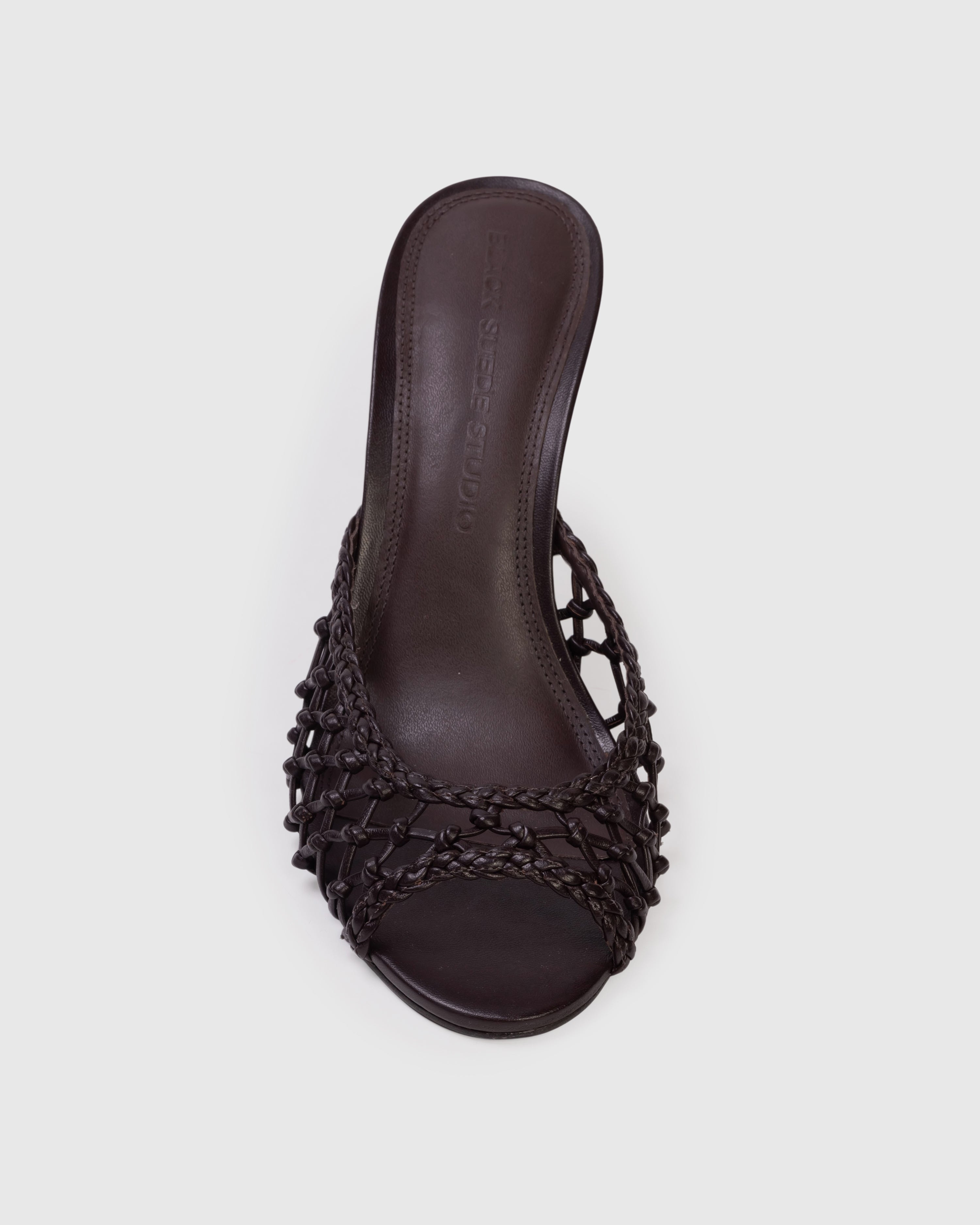 Round toe slip-on mule crafted from supple buffed leather, adorned with artisanal handwoven leather detailing. Elevated on a refined curved pin heel for an effortlessly sophisticated silhouette.