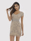 Short V neck cap sleeve dress fully embellished with rhinestones, beads and pearls. Stretch tulle fabric on polyester lining. Wear this to your formal or for a girl's night out!