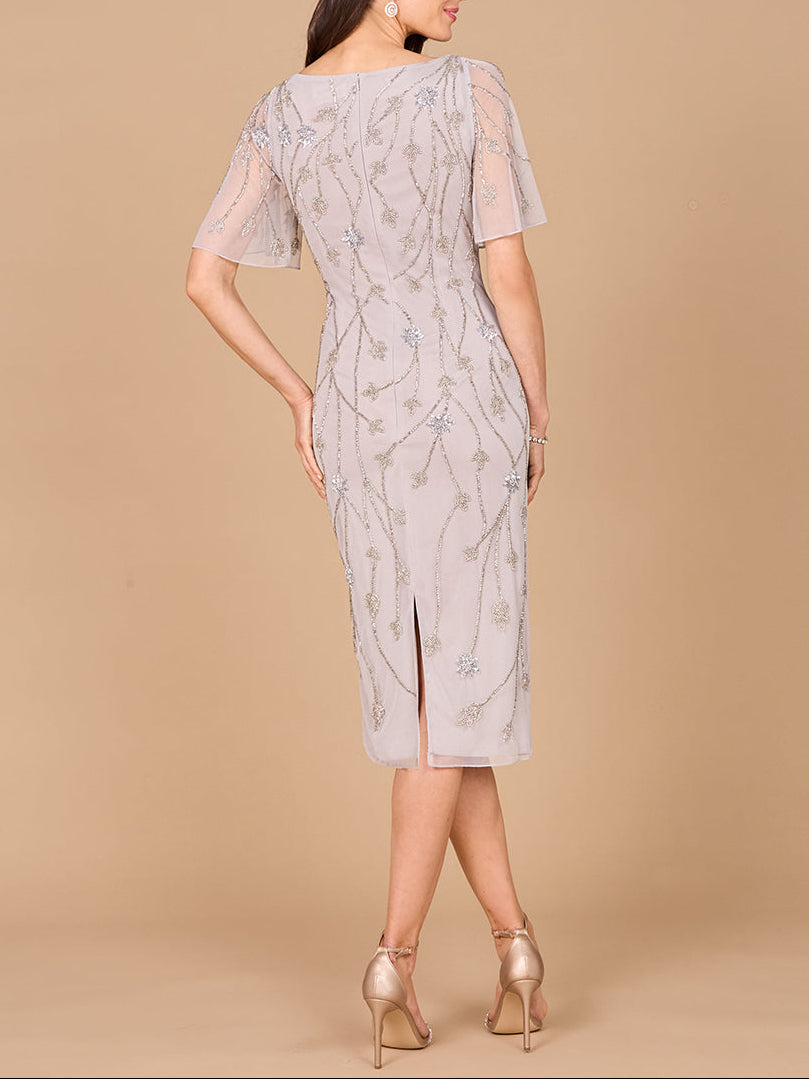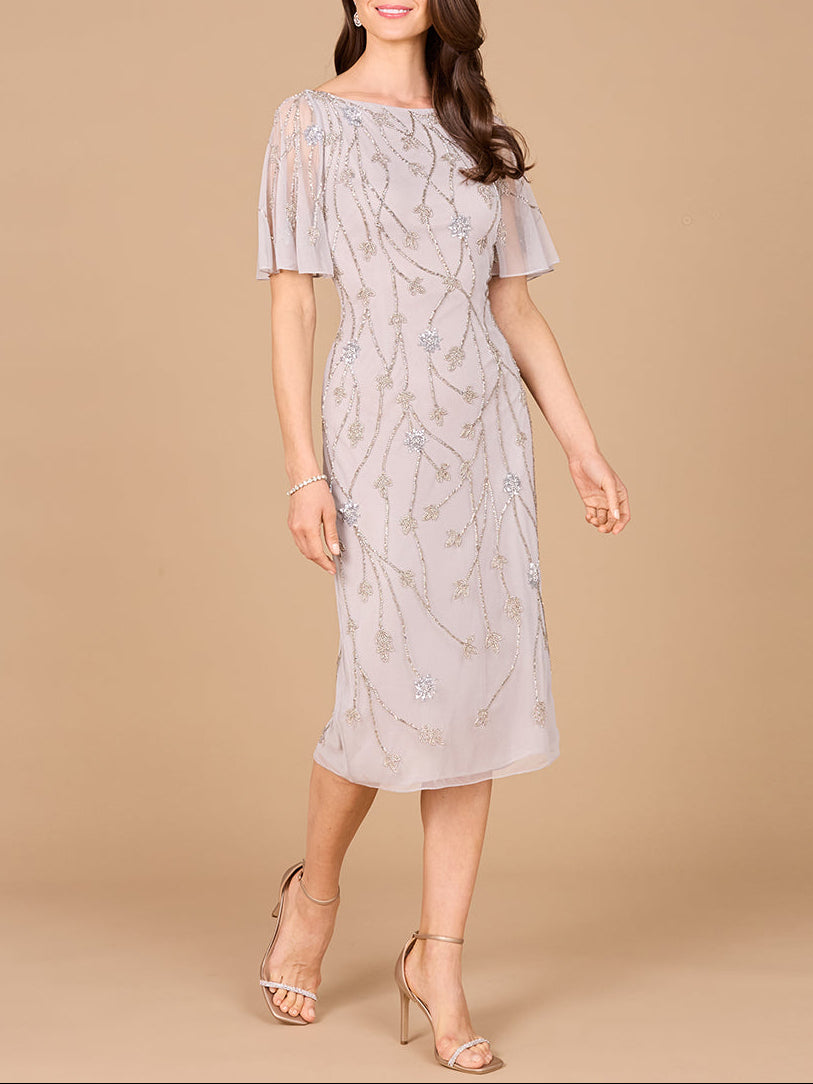 Feel like a true art piece in this classy beaded midi dress with cape sleeves. The high neckline and cape sleeves add an elegant touch, while the intricate beaded vines capture the essence of luxury. The midi length adds a sophisticated edge to this exclusive design. Elevate your style and make a statement at any event.