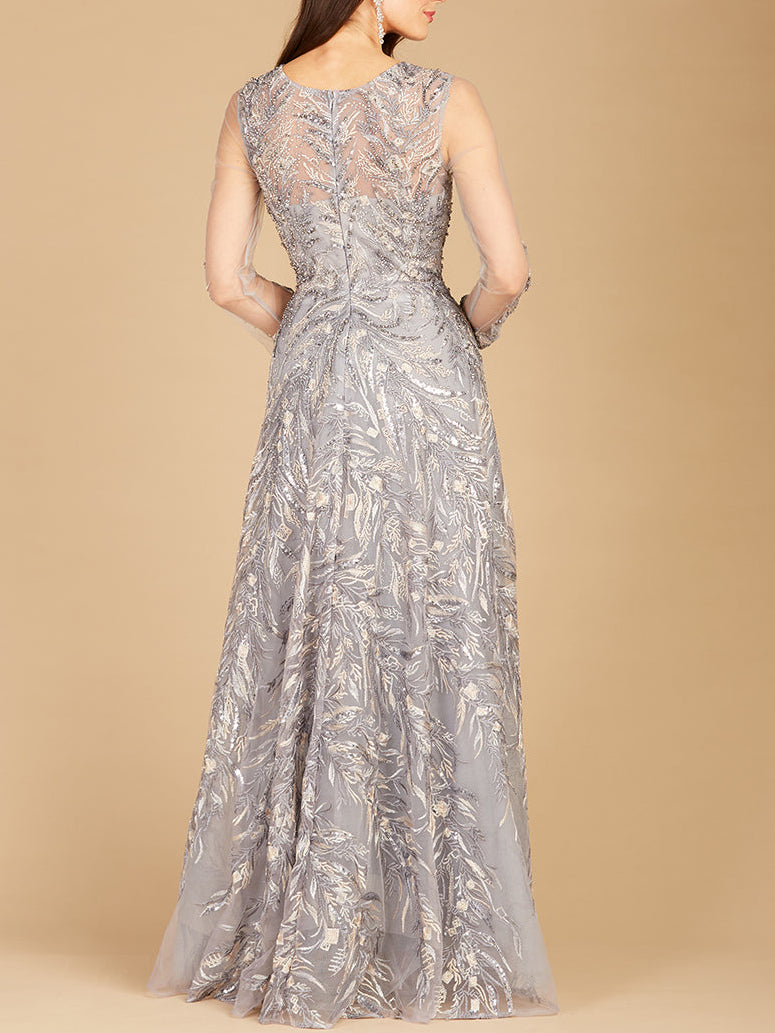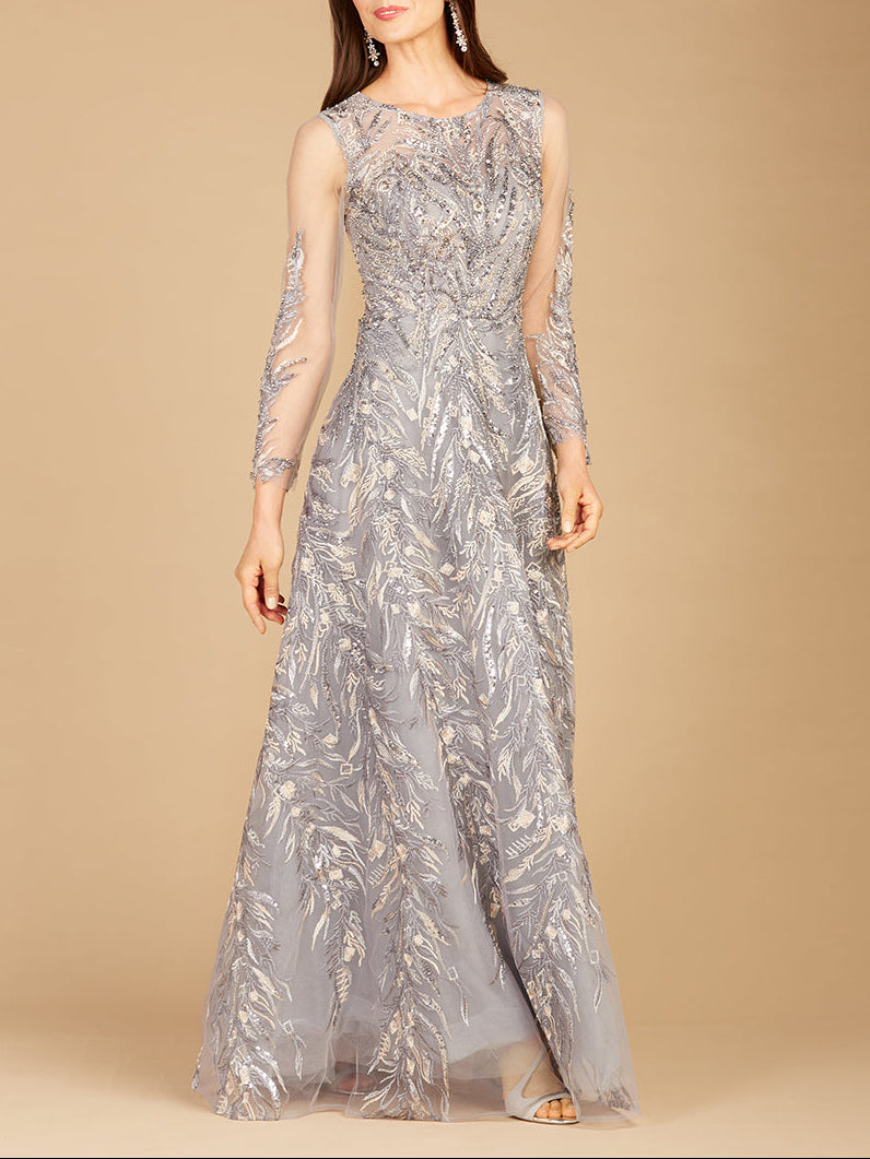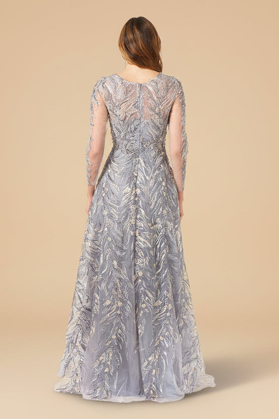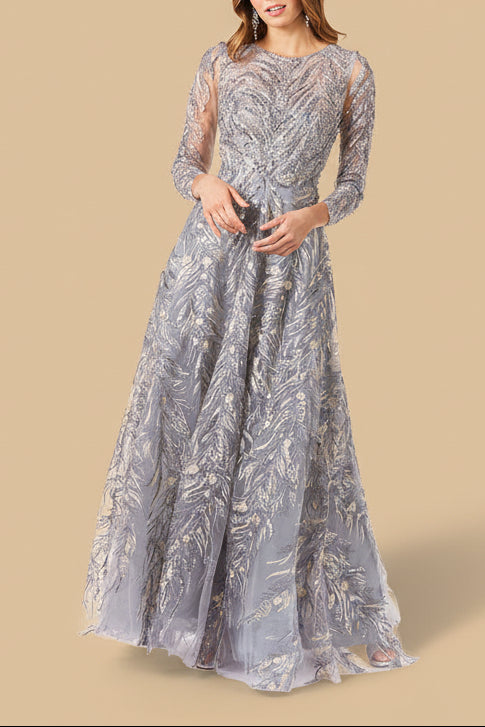 Make a radiant entrance in this beaded A-line evening gown with long sleeves, designed to combine timeless elegance with striking detail. Featuring a delicate illusion neckline and intricate allover embroidery with gold bead embellishments, this gown captures the light beautifully while maintaining a refined and sophisticated silhouette. The sheer illusion bodice and sleeves create an elegant layered effect that highlights the ornate embroidery while providing graceful coverage.